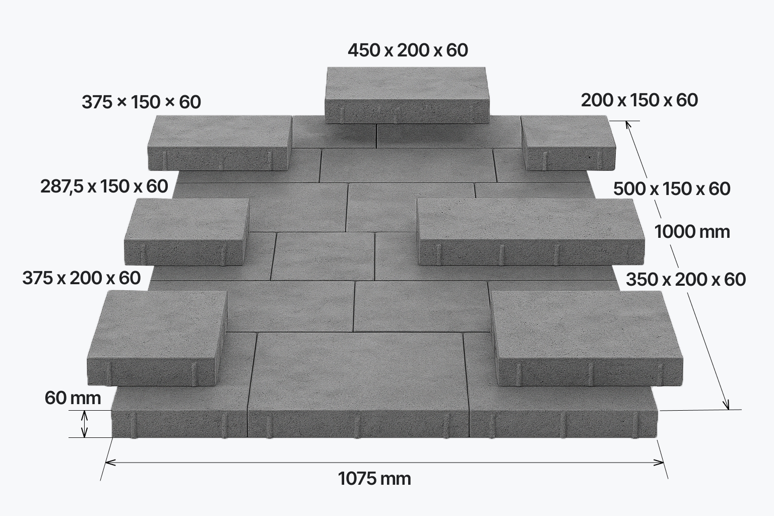 Бетонная тротуарная плитка «Велле» — мультиформат, состоящий из 7 взаимозаменяемых разноразмерных элементов мощения, толщиной 60 мм.
